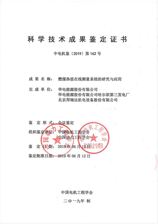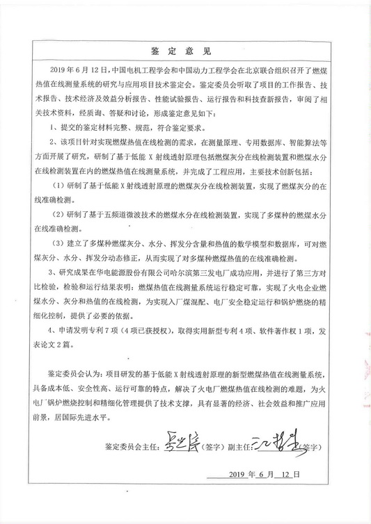 2019年6月12日,中國(guó)電機(jī)工程學(xué)會(huì)和中國(guó)動(dòng)力工程學(xué)會(huì)在北京聯(lián)合組織召開(kāi)了燃煤熱值在線測(cè)量系統(tǒng)的研究與應(yīng)用項(xiàng)目技術(shù)鑒定會(huì)。